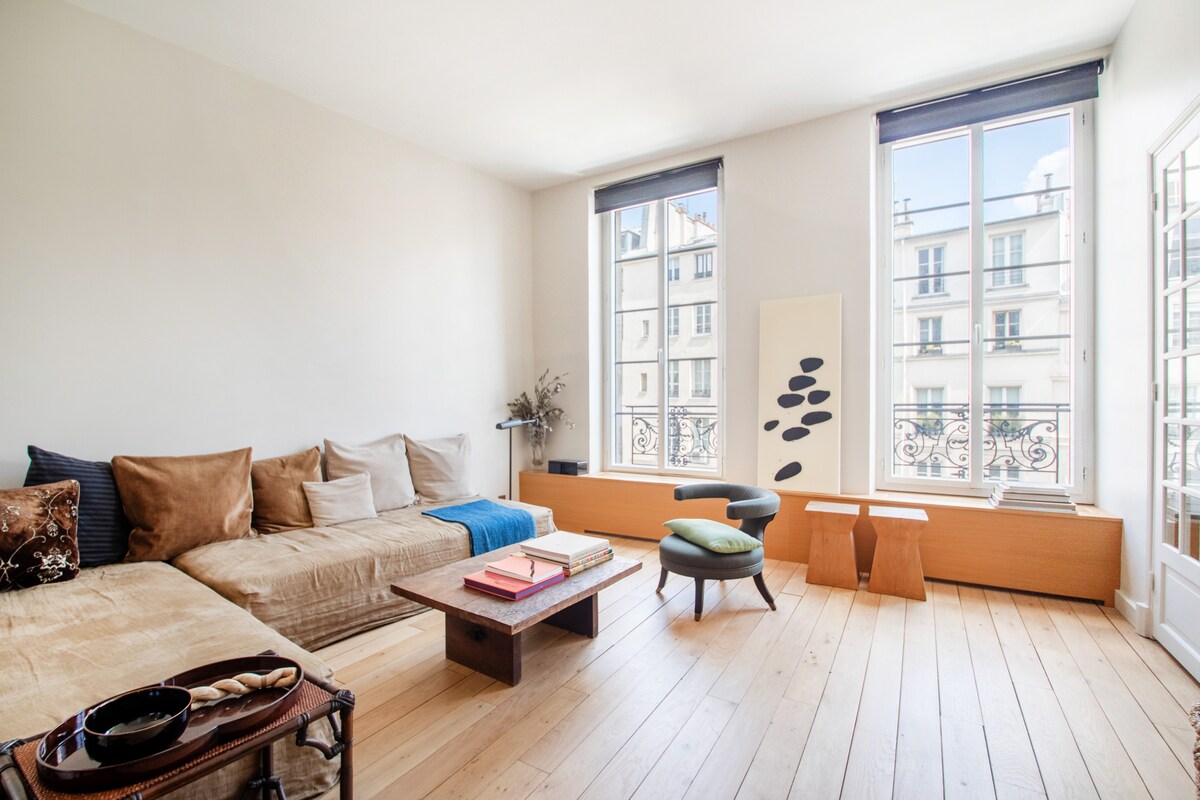 This unique parisian style apartment is located in a high standing building in the heart of Marais. You have the entire apartment to yourself. No one else will be there during your stay. Very elegant. Decorated by a famous interior designer Wooden floor, antique moldings, fire place. Super bright and comfortable. Quiet and spacious with a huge 40m2 living room. Masterpieces of contemporary art. Stunning view from the balcony Perfect for couples celebrating a romantic event or business trip
