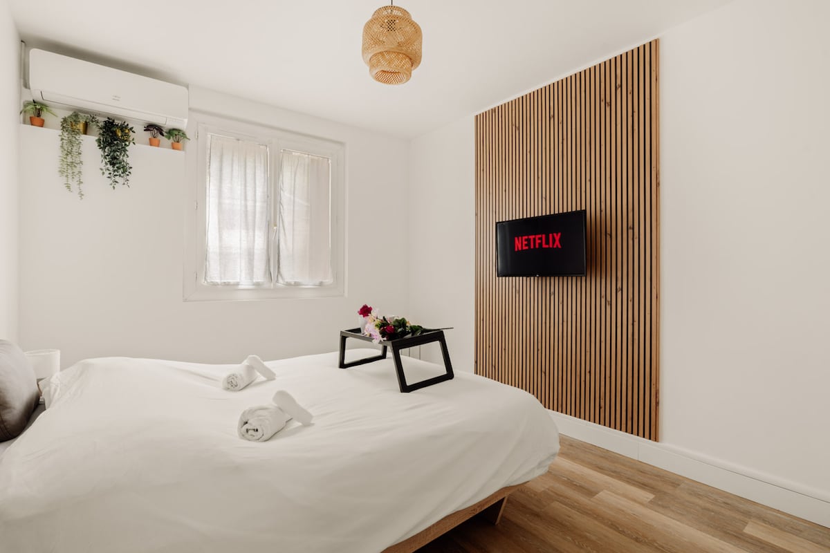 04/02/2025 : high-quality new bedding You will be welcomed in a brand new air-conditioned flat with a cosy atmosphere and a small private balcony. The flat has been entirely designed and decorated with the comfort of our Guests in mind, so that you can enjoy an unforgettable experience during your stay in Lyon 8ème. Relax in calm and elegance. You will be close to the Tony Garnier Museum, the Maison de la Danse, the famous Gerland district and 5mn from the city centre and Place Bellecour.