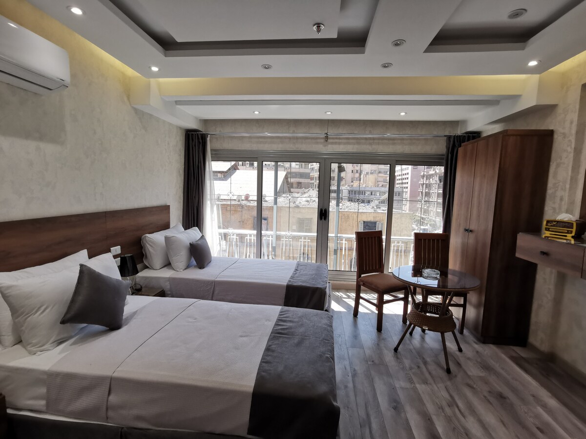 this stylish room is located at the heart of Downtown Cairo, 500 meter away from the iconic Tahrir square . the room is an 3 min walk from the Egyptian Museum and is surrounded with all kinds of restaurants and cafes. the room features as a comfortable queen size bed , smart TV, AC, Wi-Fi, Mini bar , private cozy bathroom, and shared loaded kitchen. also we provide free breakfast .