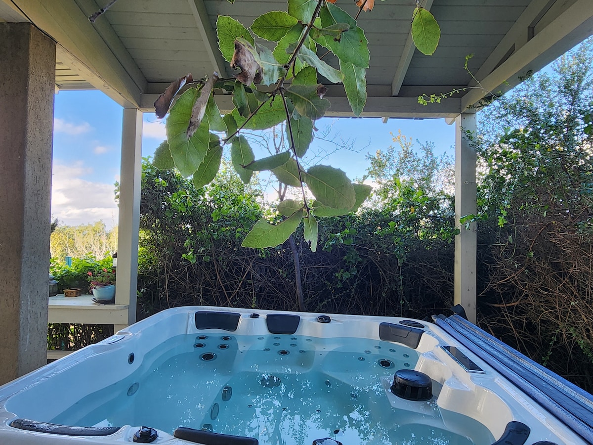 A romantic countryside guest unit in a peaceful village, offering breathtaking views of Beit Netofa Valley. Enjoy stunning sunsets, birdsong, cool summer evening breeze, and a perfect setting for relaxation. The unit includes a covered outdoor terrace with a cold/heated massage pool (MSpa jacuzzi) overlooking the view. Step onto scenic trails and immerse yourself in unforgettable nature. Ideal for couples seeking peace and a deep connection to nature (a forest just below the house).