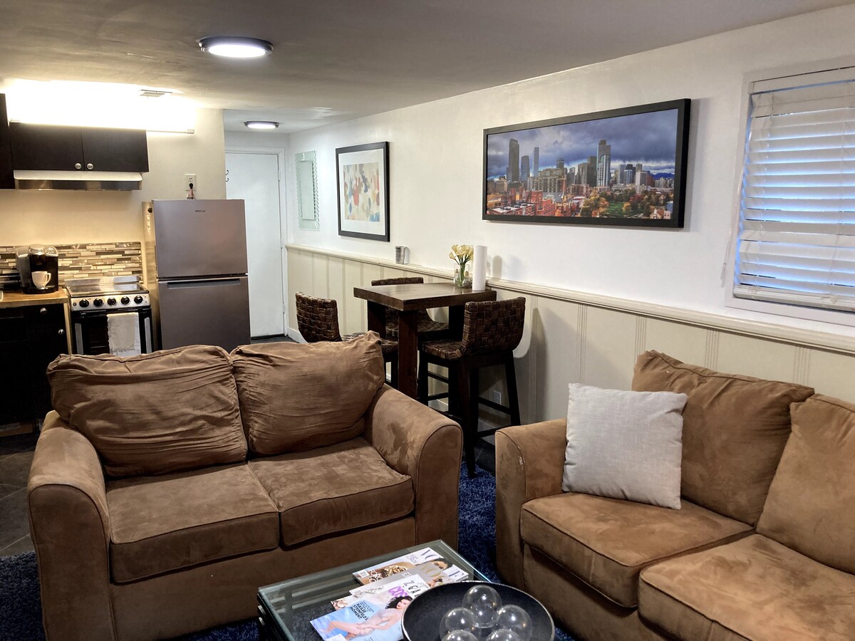 Welcome to my home in the heart of the city. Your space is a renovated basement in my home, which includes; living room with cable TV. Bedroom #! with queen bed. Non conforming Bedroom #2 with a daybed with pop-up trundle unit. One full bath, which is located off the smaller bedroom, access is thru that bedroom. Kitchenette, pub table with stools. Sliding door with lock @ foot of stairs leading into the apartment. Shared backdoor entrance with coded lock. Close to everything Denver.