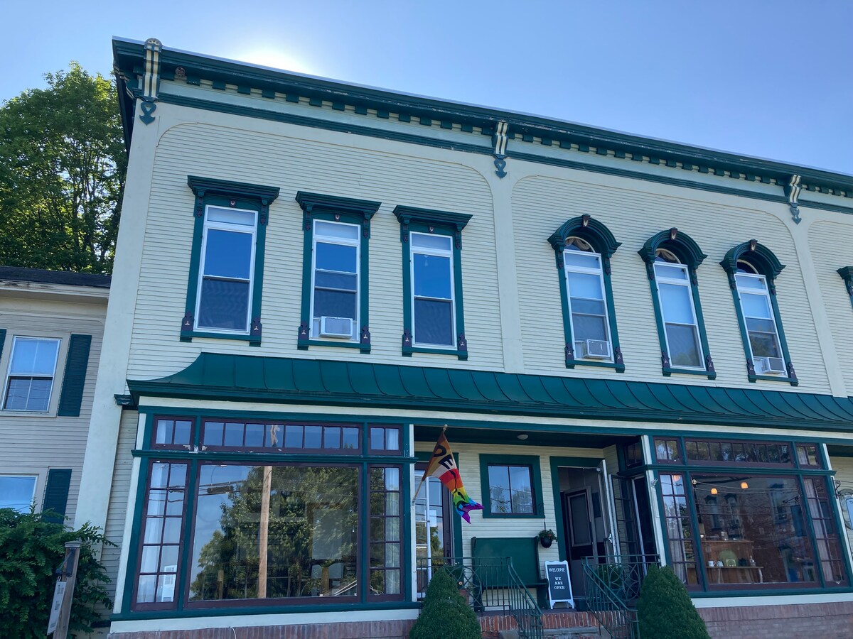 The Cozy Cathedral is a fabulously comfortable room for a getaway staycation, a return to Middlebury for College alum or a great welcome for folks experiencing town for the first time. The cathedral ceilings showcase the exposed beams original to the 1840's building. Windows in the room and the bathroom provide natural light and views to the Otter Creek The tiled shower includes a tub and salon quality hair products. Individual temperature controls ensure your comfort.