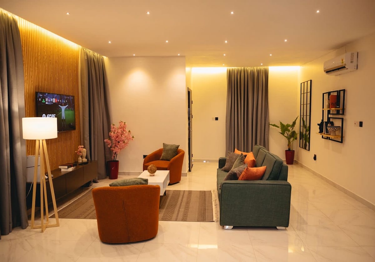 Welcome to your luxurious home away from home. This elegant 2-bedroom apartment offers a warm, homely feel with high-end finishes, reliable WiFi, 24/7 standby power, and access to a private gym. Nestled in a secure, serene gated community -jak Royale Apartments. it’s the perfect blend of comfort, class, and convenience.