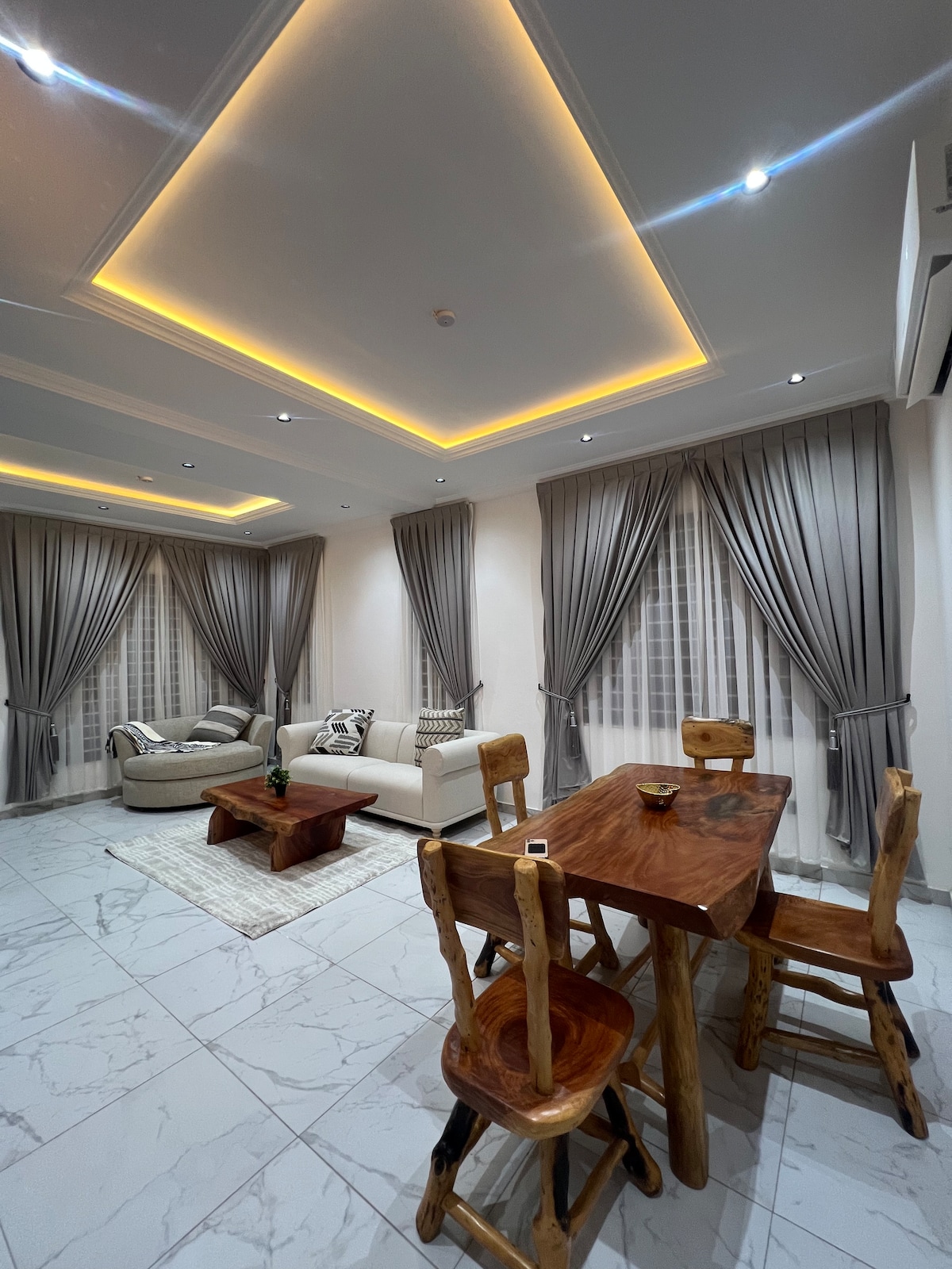 This apartment is located within Mariville Homes Estate, a gated residential community off Spintex Road, near Manet Junction. Conveniently situated just a 15-minute drive from the airport, the property offers a secure and serene environment. The estate is gated and monitored 24/7 by private security, ensuring controlled access. The apartment features two bedrooms and can comfortably accommodate up to four guests. Both bedrooms are en suite and feature king-size beds.