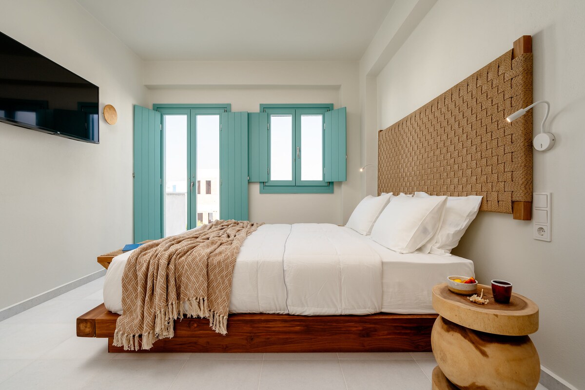 Our elegant double suites offer a serene and inviting escape. Each suite features a comfortable double bed, a modern bathroom with a refreshing shower, and a private balcony that opens to an unforgettable sea view. Breakfast of Olive Vista Suites is served at our family-owned Irida Vacation Suites, just 1.5 km away, where you can also enjoy the pool and all-day bar/restaurant, perfect for a relaxing swim or a sunny break.