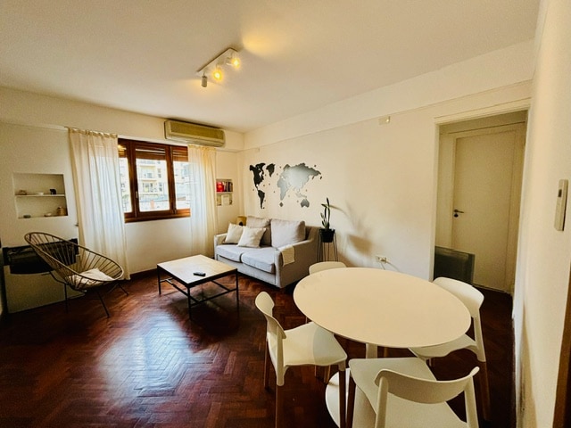 Apartment with two spacious rooms (living room and bedroom), equipped kitchen, and elegant and modern bathroom. Very bright and quiet. Air conditioning (hot/cold), microwave oven, refrigerator with freezer, washing machine, electric kettle, 50" smart TV, carbon monoxide detector, double bed in the bedroom and sofa bed in the living room (+ extra inflatable mattress). Close to bars, restaurants, ice cream parlors, and a well-known cultural center. Steps from the Faculty of Agronomy park.