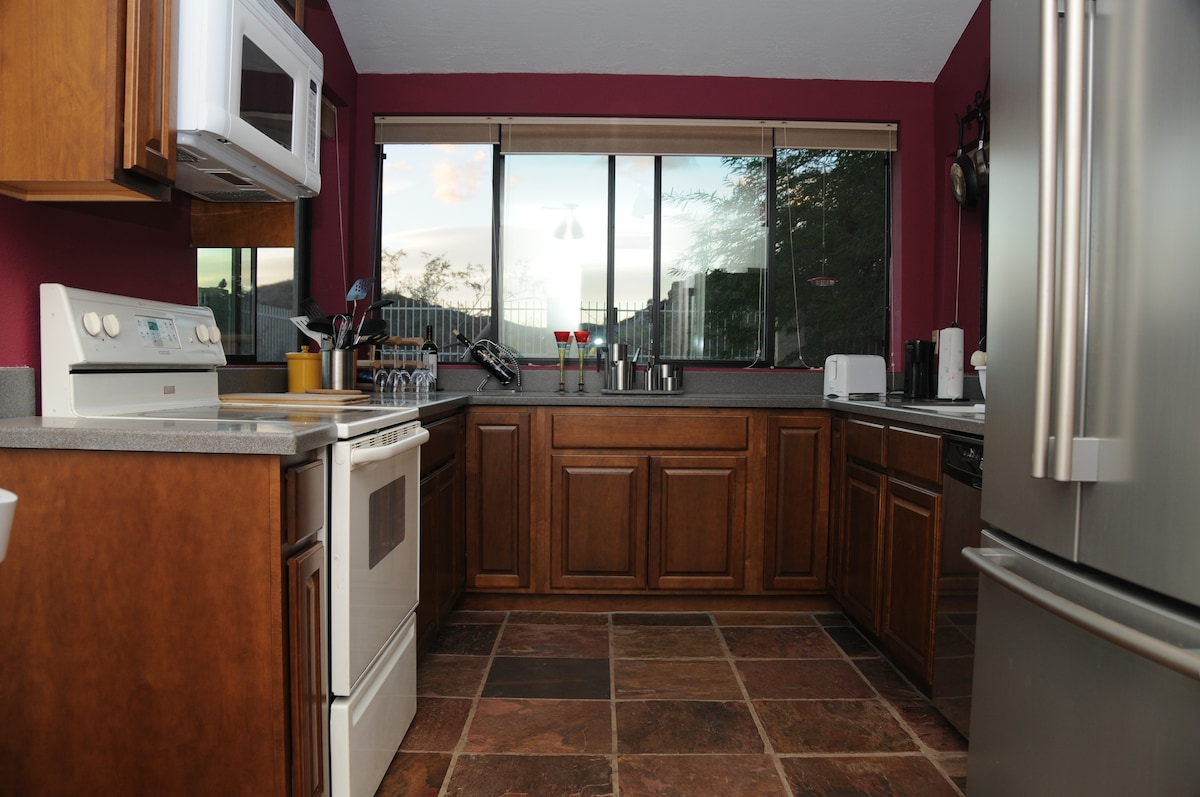 Fab guest suite in Ahwatukee upscale neighborhood! Spacious suite is attached but separate from main house with it's private entry and patio. One large bedroom with king sized bed, bath, huge great room with stunning kitchen, views of the garden and pool. Close to freeways, airport, S. Mountain, Tempe/Chandler, restaurants, dining & family-friendly activities. Easy access to downtown Phoenix, Scottsdale, and other valley cities. Great for couples, solo adventurers, business travelers, families.