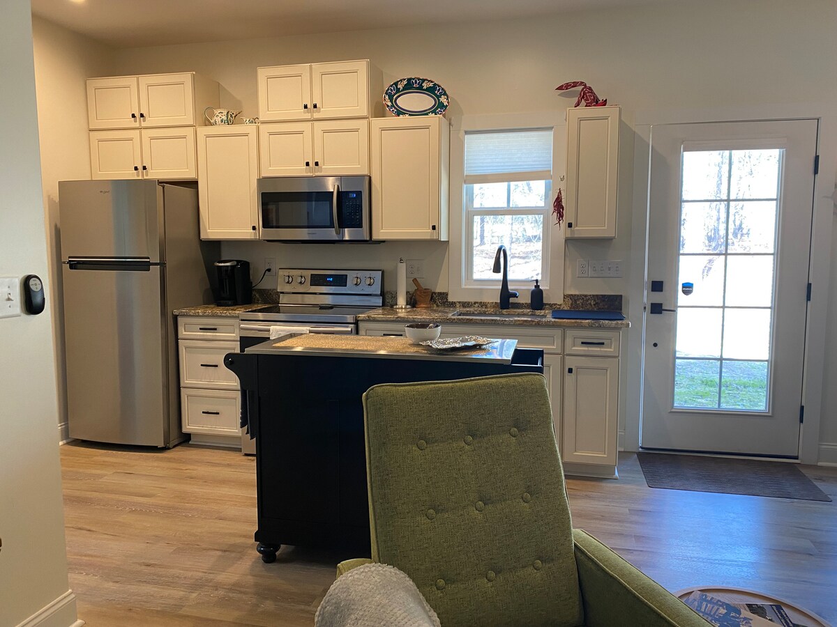 Bright, charming 408 sq ft studio apartment with a queen bed, work desk, lounge chair/ottoman, 3 piece private bathroom and kitchenette (sink, mini frig. & microwave). Also includes a dedicated closet, well stocked coffee station, smart TV, luggage rack, full sized ironing board and blow dryer. Windows and french doors offer roman shades with blackout panels for privacy. Access to a outdoor fire pit seating area is also included. Convenient to local attractions in Aiken, SC and Augusta, GA.