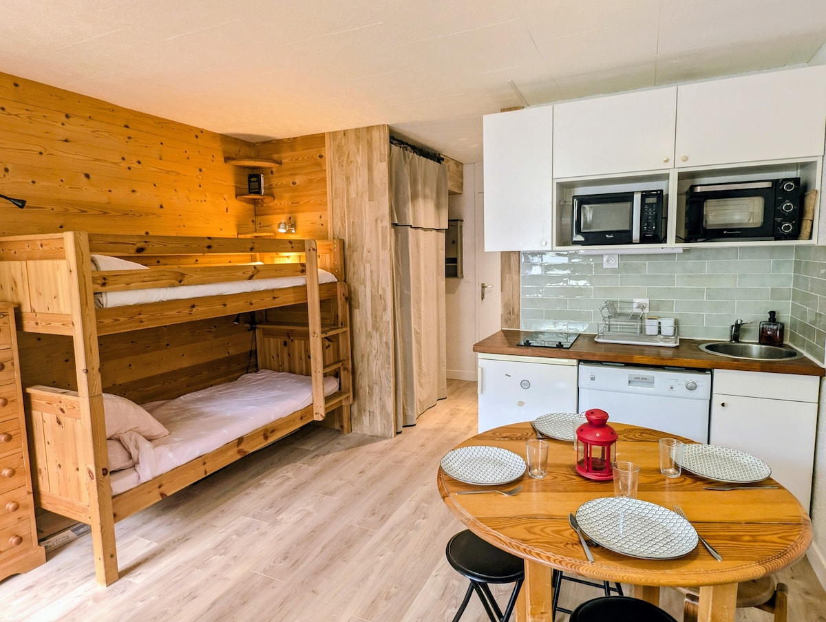 Duplex for 6 people, well furnished and equipped for a very nice stay in the mountains. Bed composition: 1 double bed and 1 sofa bed 160 x 200 and 2 bunk beds. Bedroom and mountain area upstairs. Ski departure and return in front of the residence. Apartment right across from the ski school and cable car and in the heart of the resort: shops and restaurants. Fully equipped kitchen. And for your evenings, raclette/stone grill and fondue Ski locker on the ground floor