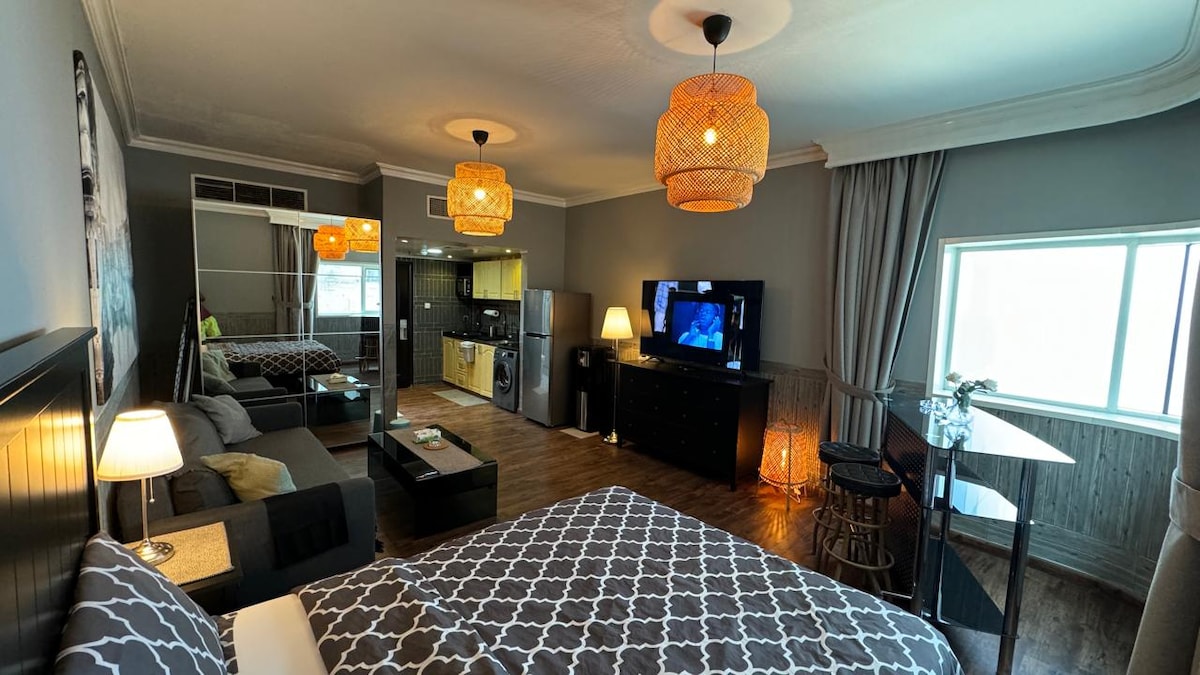 "Welcome to our chic studio apartment in the serene neighborhood of Al Amerah, Ajman. Ideal for a relaxing getaway, our thoughtfully designed space offers modern comfort. Enjoy the convenience of a fully equipped kitchen, unwind in the cozy living area, and take in the scenic views from your private have. Book your stay in our studio for an unforgettable experience, blending modern comfort with the coastal allure of Ajman. We can't wait to welcome you to your home away from home!".