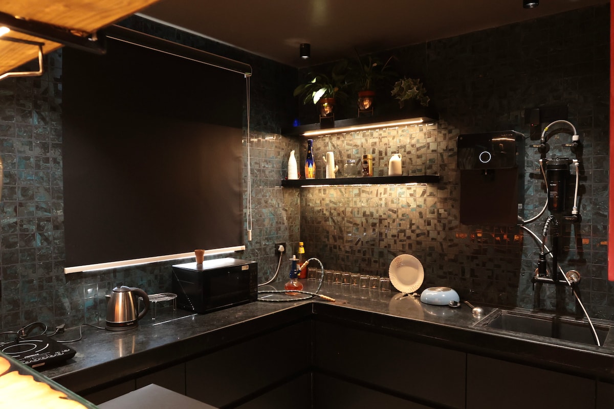 Dolce Den – A Luxe Artistic Stay in Jaipur Expansive Patio: Perfect for morning coffee or starlit soirées. Entertainment Suite: State-of-the-art projector and sleek pool table for ultimate fun. Opulent Bedrooms: •Lunar Retreat: Drift under moonlit art and serene murals. •Flamingo Suite: A vibrant flamingo-inspired luxury Gourmet Open Kitchen & Bar: A chic space for culinary creations and stylish sipping Dolce Den blends serenity and opulence for an unforgettable experience.