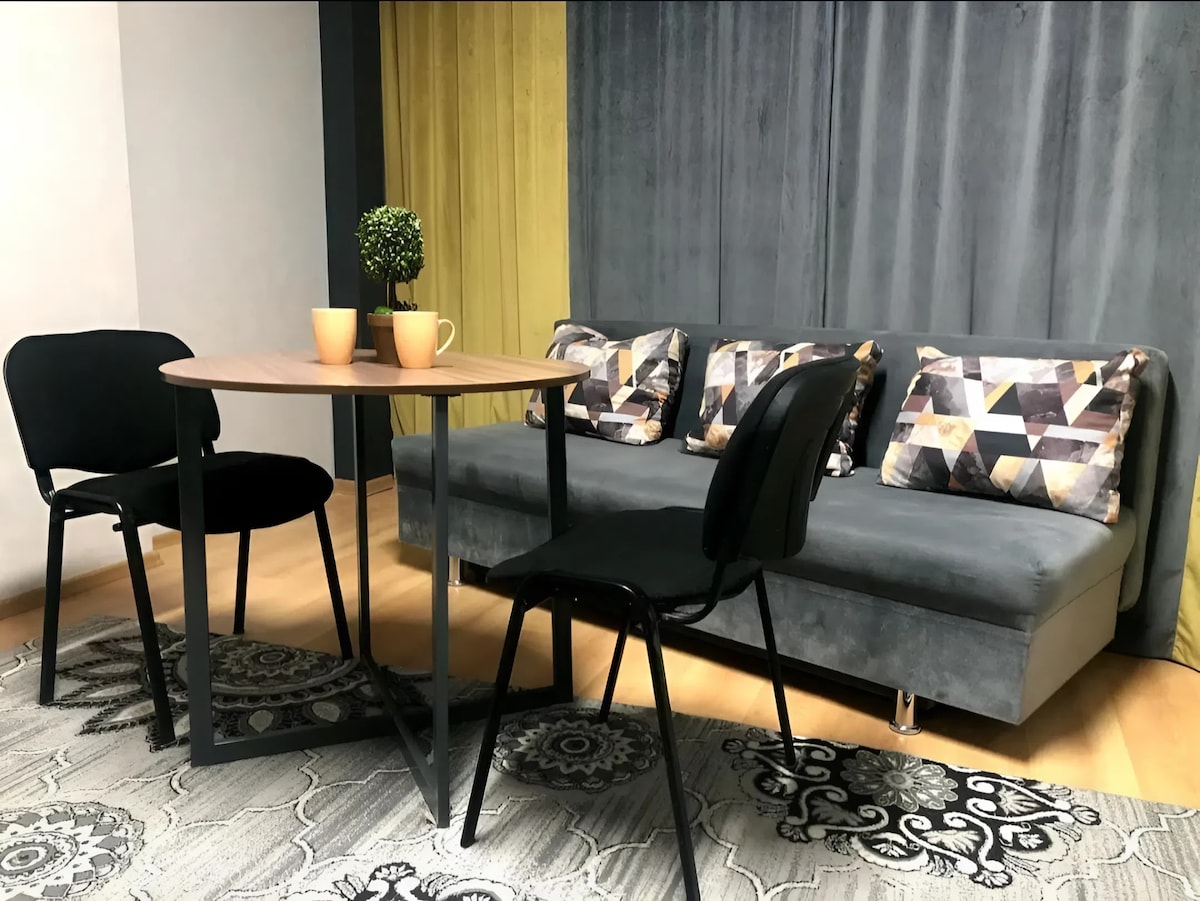 Reload in this calm and stylish place. The apartment has everything for your rest and comfort. The bedroom has a smart TV with internet , a comfortable bed and an additional sofa for relaxing . The kitchen is equipped with an electronic kettle and a microwave with a built-in new refrigerator, a gas stove is all for your use. The bathroom has a washing machine , hairdryer . There are also small appliances like an iron, a dryer and all other accessories , terry snow-white towels as well.
