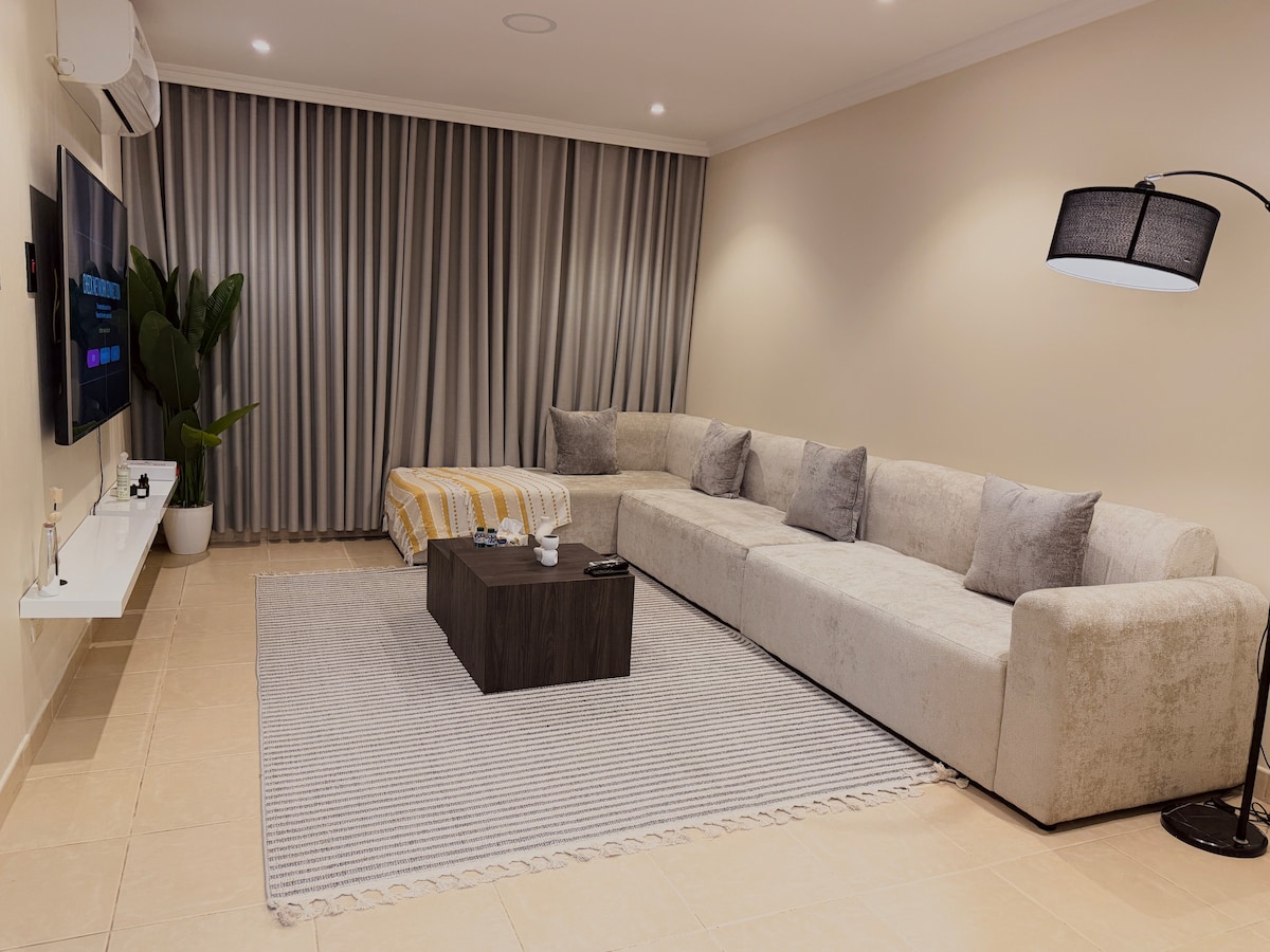 Modern hotel apartment in Al Fanateer neighborhood – Jubail Center The apartment consists of a room and a hall equipped with neat furniture, a comfortable bed, and a 70-inch screen with a Netflix subscription. The apartment has fast WiFi, self check-in, private parking, and is located close to the Corniche and a prime location with easy access to surrounding services and facilities.