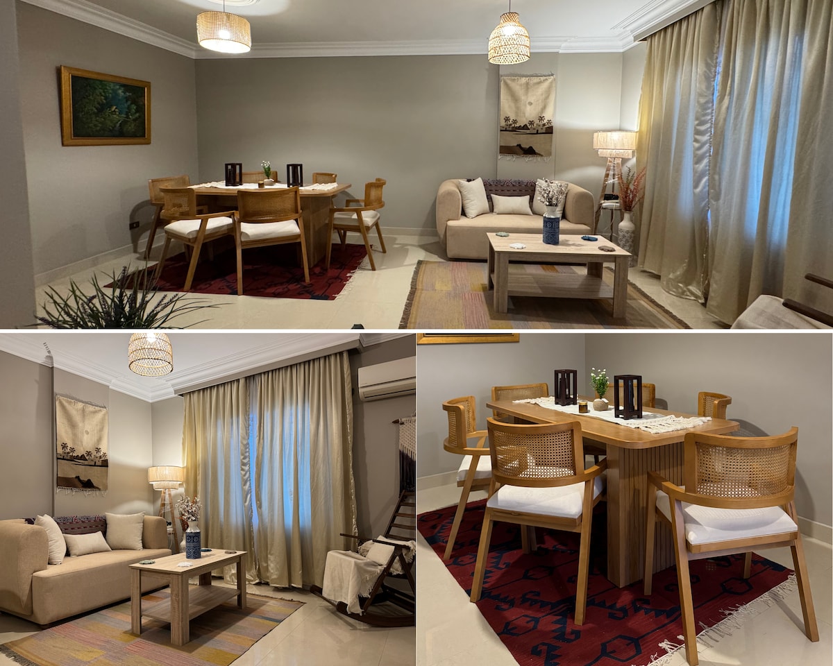 Kick back and relax in this calm, stylish space. An ENTIRE APARTMENT with an airy large terrace, situated in beautiful rehab city which is located 10 minutes away from Heliopolis and Nasr City, on the Cairo Suez road. Rooms are newly furnished, air conditioned in the bedrooms well DESIGNED , have all amenities, SAFE , super CLEAN and QUIET . . Coffee shops, restaurants, supermarkets,and pharmacies are all nearby. It's 20 minutes to Cairo international airport.