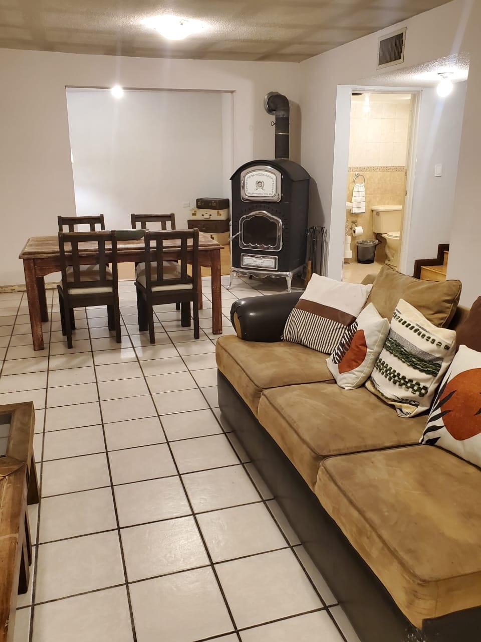 Se ubica en el Km 16 de la carretera Chihuahua-Aldama, a 20 min del centro de Chihuahua. Bonita casa con techos altos y espacio acogedor. Mi alojamiento es bueno para parejas, viajeros de negocios, familias. Son 3 recámaras king size con baño, y cocina equipada con estufa, utensilios para cocinar, platos y vasos Jardín grande para comidas o juegos. No se permiten invitados externos. NO SE RENTA PARA FIESTAS, REUNIONES NI EVENTOS!