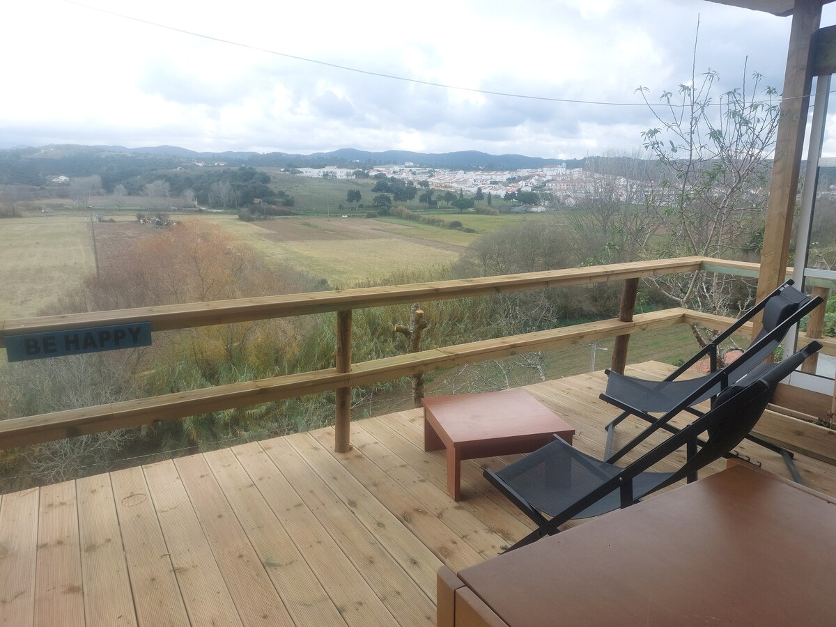 Recently rebuilt house located at the Castle's hill in the centre of Aljezur, with outstanding views over the old neighbourhood and the fields. The house is ideal for to 2 people and comprises double bed, modern design bathroom and open space fully equipped kitchen and living room with a fireplace for colder days. The cozy deck terrace is amazing for your alfresco meals, relaxing and reading, with stunning views over the old village.