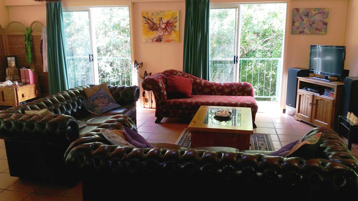 Samsara is on Magnetic Island in North Queensland, adjacent to the National Park & seasonal creek with nearby rockpools & waterfall The house has great ambiance with fabulous views & visiting wildlife. Samsara is great for couples, solo adventurers, and families. It is located in a quiet residential street & is surrounded by natural vegetation, granite boulders & accompanying wildlife. Friendly Kookaburra's, Koala's in the trees, Wallabies & Possums in the evenings & some glorious butterflies.