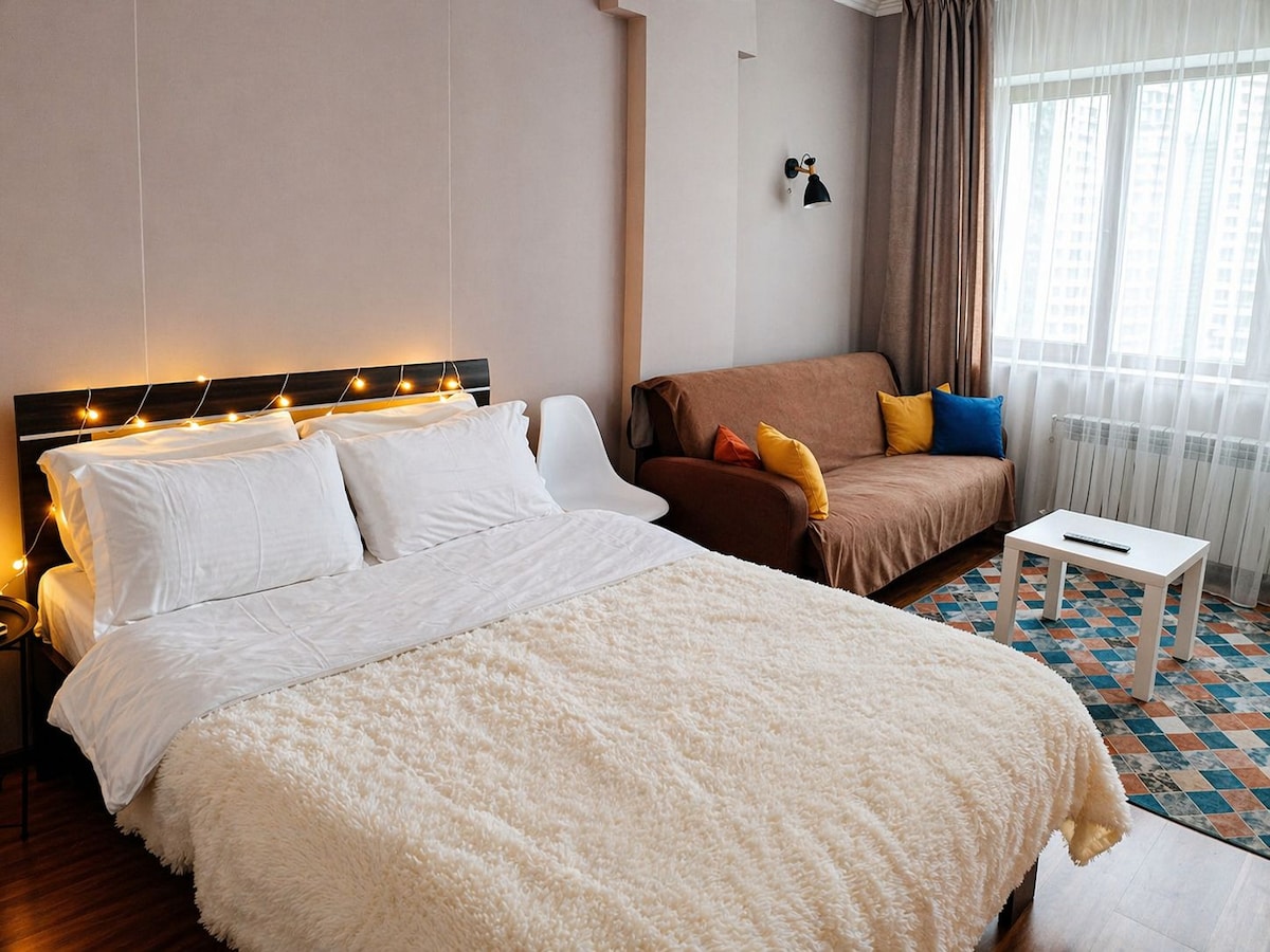Welcome to your ideal stay in Almaty! Enjoy breathtaking mountain and city views right from your window. -7 minutes to Metro Station -сomfortable bed and cozy sofa -fully equipped kitchen -modern bathroom with fresh towels and toiletries - Wi-Fi and SmartTV The apartment is located in a safe and lively district, close to cafés, supermarkets, pharmacies, shopping malls! Self-check-in available Always ready to assist you — feel free to message any time. Relax, explore, feel at home!