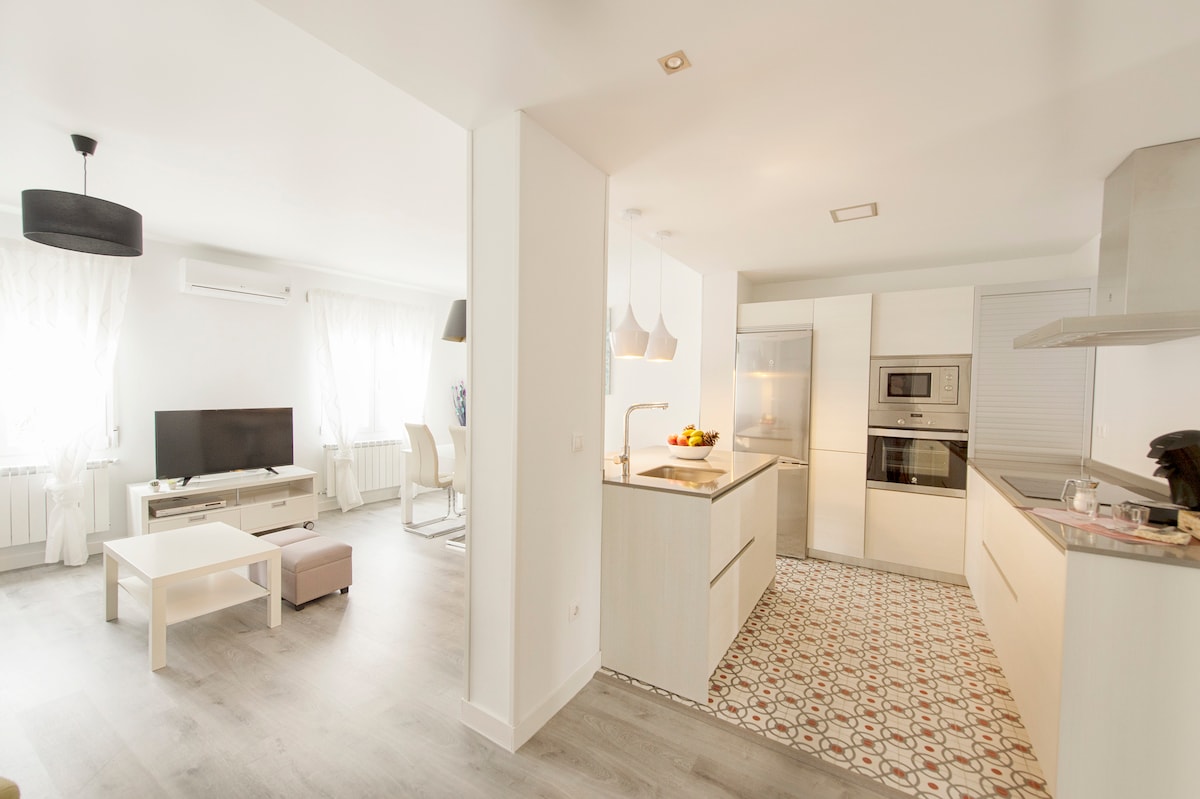 Apartment at street level. Ideal for business trips, study trips, medical matters, etc. with ceramic hob, refrigerator, washer/dryer, dishwasher, hot/cold air pump, microwave, Nespresso, complete kitchen utensils, kettle for infusions, double bed, sofa bed 190x150, smart TV, Wi-Fi, alarm, direct metro line to Sol (15”), large bathroom, rain shower, automatic gel dispensers. Garden area, very easy parking, with two children's playgrounds with swings