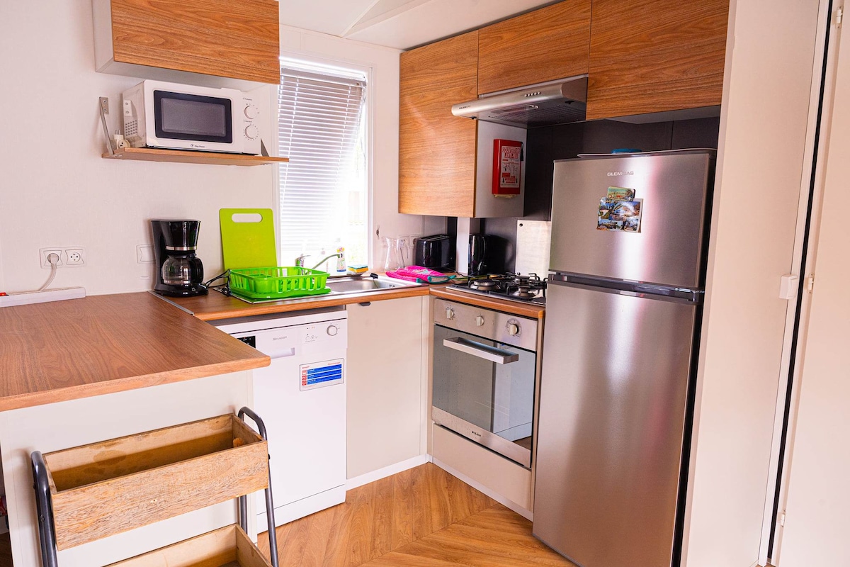 MOBILE HOME 6 people 40 m² with reversible air conditioning, large enclosed outdoor terrace with 1 secure gate, garden furniture, 2 deckchairs. Large living room with adjustable TV, 1 2-seater sofa bed, 2 large bedrooms including 1 master bedroom, premium bedding with large dressing room and TV Equipped kitchen, dishes, oven, microwave, stove, fridge with freezer, toaster, kettle, filter coffee machine and TASSIMO pods, dishwasher, washing machine and clothes rack.
