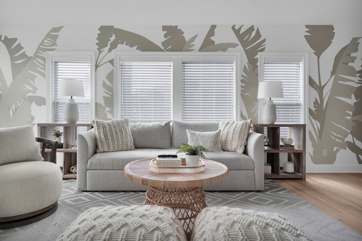 The living area features a comfortable sectional sofa arranged around a coffee table, with a large television mounted on the wall. Natural light fills the space through windows, and coastal-themed decor is displayed on a side cabinet, enhancing the inviting atmosphere.