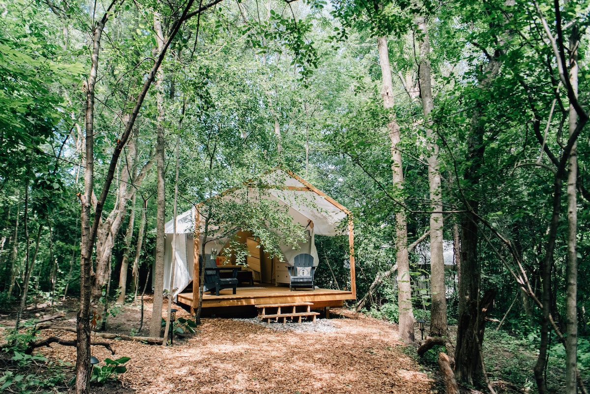 Luxury Glamping near Elora on a private 17-acre flower farm. Tucked within a forest, each tent offers a private hot tub for a refined, nature-forward stay, with Fox and Firefly also featuring private decks and fire pits. Visit the alpacas or walk to nearby trails and into town. As an active farm and event venue, weddings may take place in the barn during your stay.