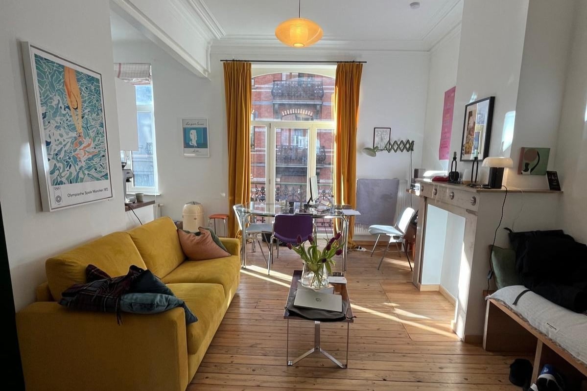 Quiet and bright apartment of 130 m2 recently renovated (2021) with high molded ceilings, on the 1st floor. Fully-equipped kitchen opening into a large dining room in continuity with a living room, an entry hall and a study. The duplex rear part of the apartment has 2 beautiful bedrooms, one with a BEKA bed, a bathroom with shower and bath, a separate toilet and a small equipped laundry room. Vintage furniture, warm and cozy atmosphere