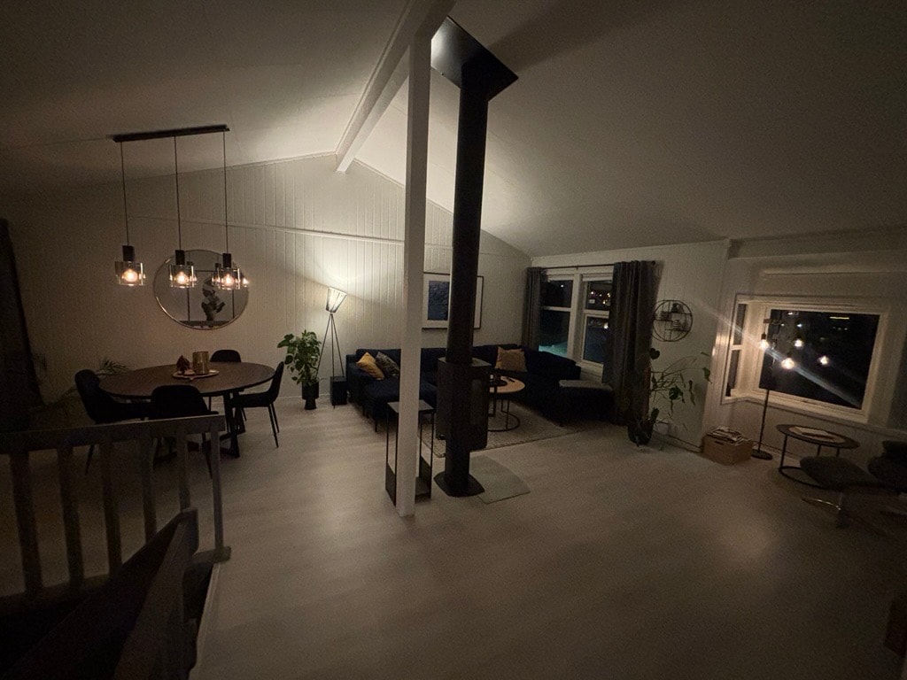 Welcome to our beautiful house overlooking the whole of Harstad! Here you live with stunning views, in quiet surroundings close to both nature and the city center. Only a 15-minute walk to the city. In the winter you may be lucky enough to see the northern lights right outside the door. It is a perfect place for those who want to relax, experience the midnight sun in the summer or the northern lights in the winter. Whether you travel alone, as a couple or with family, we facilitate a safe, cozy and memorable stay.