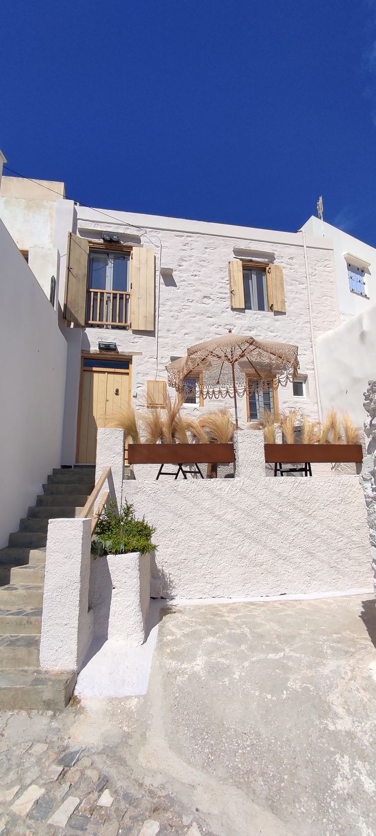 This place has a style of its own. Located in the center of the medieval settlement of Ano Syros. The house has a private ( only for the guests ) upper terrace ( reachable by ladder ) with the stunning sea view of Ermoupoli with its port/shipyard. There is a private outdoor dining area , sunny all day long . Many restaurants , caffès and stores are just around the corner. The nearest parking lot is 4 min by foot. Don’t forget the stairs of Ano Syros , there are many !