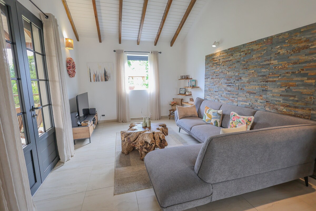 On the heights of Ste Anne, charming private cottage located 5 min (3 km by car) from the shops and heavenly beaches of Club Med, Bois Jolan and the village. Thanks to its dominant position, the 3,000 m2 property benefits from an exceptional setting and natural ventilation. Ideal for nature lovers, this cottage with private pool nestled in a green setting will offer you the tranquility, calm and privacy to recharge your batteries during your stay.