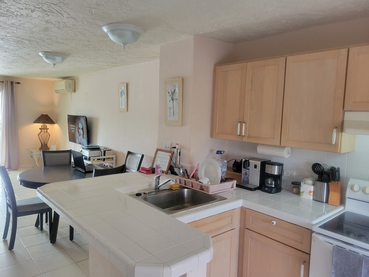 Townhome with 2 bedrooms, 2.5 bathrooms, 1200 sq. feet (111 sq. meters). Water facing private deck and 2 balconies with western sunset views. Fully stocked and equipped kitchen. On-site private parking for smaller cars; parking for larger vehicles a few steps away. Gated community with restaurants, bars and cafes, golf course, marina, supermarket, banks and rental car agencies. 10-minute walk to North Beach and golf course, 20-minute walk to restaurants, shops, other amenities.
