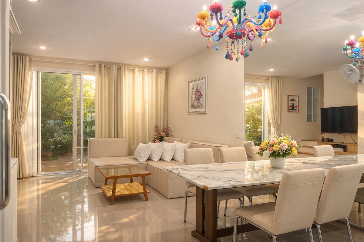 Looking for a peaceful, spacious family home near MRT? This 4-bedroom house has it all: a large garden, pool & gym access, 1000Mbps WiFi, and a fully-equipped kitchen. Just 10 mins to Fashion Island. Perfect for families, seniors & work-from-home stays. ✔ 4BR / 3BA • Sleeps 7 ✔ Garden view + large park in front ✔ Pool & fitness access ✔ WiFi 1000 Mbps + 55” TV ✔ 24/7 food delivery to your door
