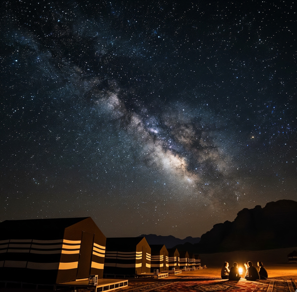 "اهرب إلى واحة الهدوء في وادي رم!" هذه ليست مجرد إقامة، بل هي فرصة للعيش تحت أصفى سماء في العالم. استمتع بالسكينة المطلقة داخل خيمتك الخاصة الفاخرة، مع إطلالة بانورامية مباشرة على الجبال الشاهقة بلون الذهب الوردي. ليلًا، اجلس على دفء نار المخيم وشاهد ملايين النجوم تضيء سماء الصحراء. تجربة بدوية أصيلة لكن بلمسة من الراحة والترف الحديث.