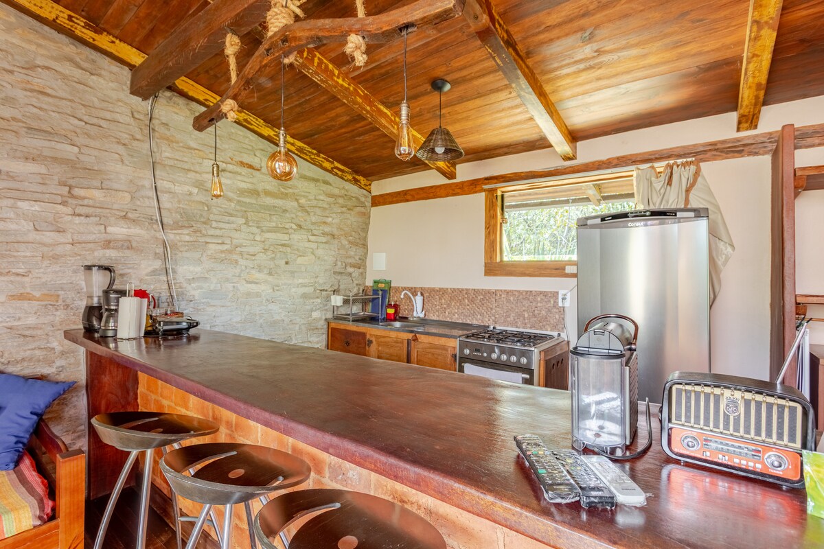 Charming chalet nestled in a rocky outcrop, built in demolition wood, stone and glass that results in a perfect union between modern facilities and the charm of nature. Jacuzzi on the deck, cable TV, air-conditioning, full kitchen, king-size bed with 4m² from where you can see the city of Pirenópolis, the sunset, the spectacular night sky and shooting stars... The site has private trails and waterfalls for guests. For groups of up to 10 people, we have the main house, Sítio