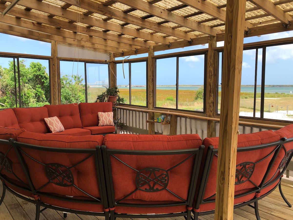 When you stay with us you stay with family. Enjoy the ocean view, private beach and rustic coastal decor throughout that brings you to true Texas. Feel at home in your room and all of the amenities of home. Including a great room shared with other guests. It includes a full kitchen, breakfast bar, dining room, and living room as well as additional seating. We provide Starlink internet access for streaming and general use. Across the street we have a private marina, boat ramp and beach.