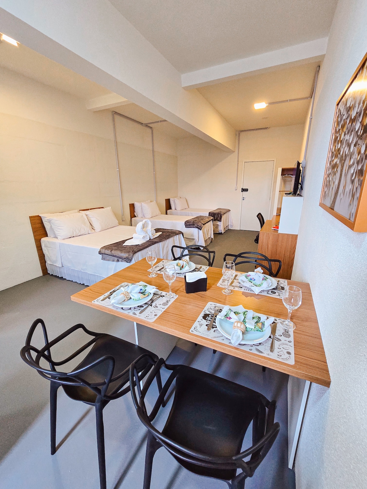 Hospede-se em um Apartamento super prático com estrutura de hotel na melhor localização da cidade, a poucos metros dos melhores restaurantes de Joinville. Ideal para estadias práticas e confortáveis. Condomínio com Piscina, Academia e Sauna. Apartamento completo de 44 m² no condomínio / hotel Prinz. Quarto com cama de casal e TV Smart. Cozinha com micro-ondas, fogão elétrico, frigobar, cafeteira e utensílios. Sala com sofá e mesa para 2 pessoas.