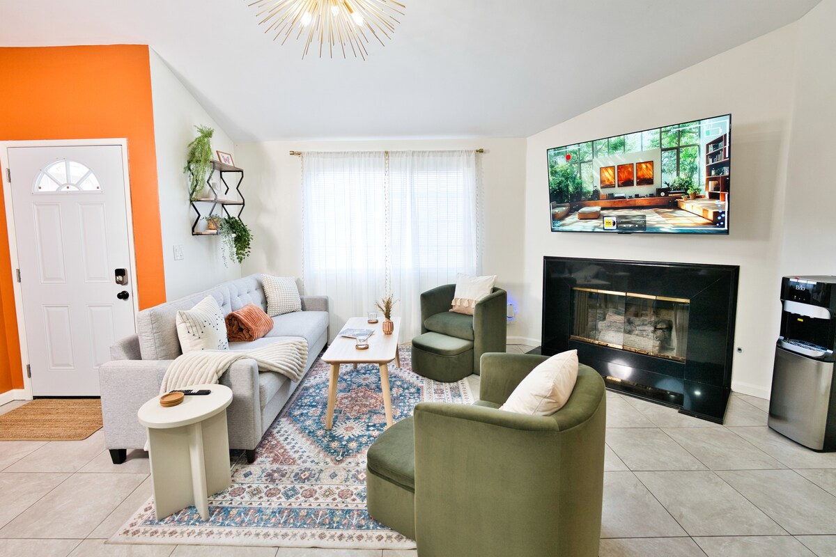 Art-filled retreat with unique artifacts, a lush garden with vibrant plants and vegetation, small pond, private pool & spa, firepit, and outdoor kitchen. Relax in a quiet cul-de-sac with two shaded patios, modern entertainment including streaming TVs, surround sound, a small pool table, and an Xbox. Ideal for families, friends, couples, or business travelers seeking comfort, privacy, and a memorable Southern California stay near Disneyland and major attractions.