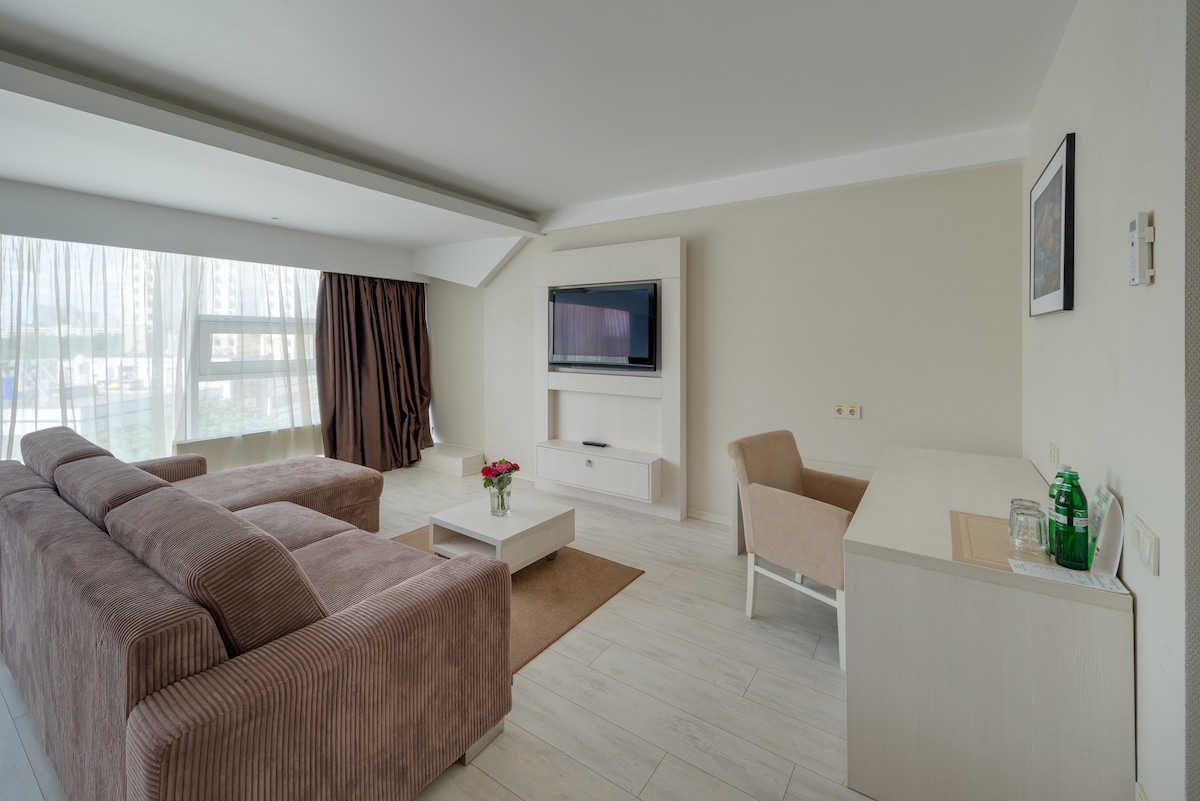 A two-room suite designed in European style. The windows offer a panoramic view of the sea and the city. Room location: 4-19 floors. The room is equipped with modern appliances, furniture, including a large double bed or two single beds.