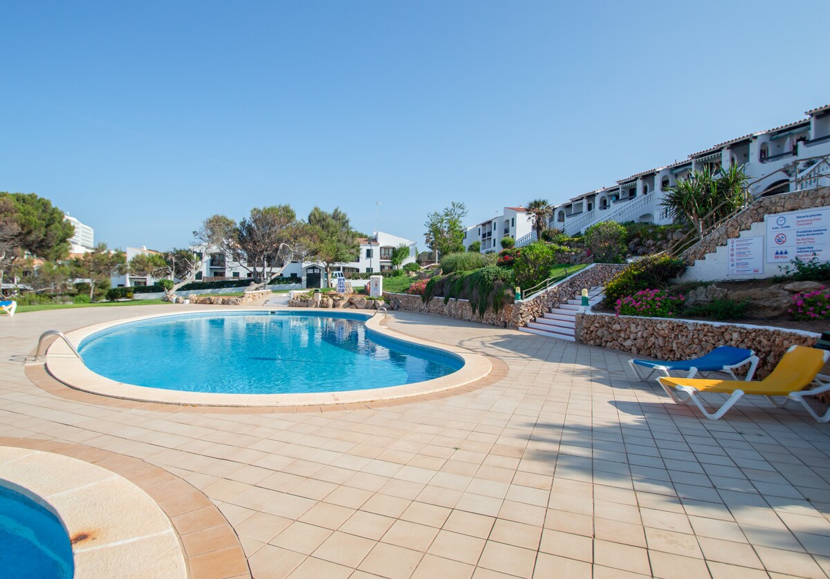 Cozy 40 m² apartment with 2 private terraces and ocean views, ideal for relaxing in Menorca. 1 bedroom, 1 bathroom, living room with integrated kitchen and 2 double beds (for 4 people). Perfect for couples or small families. Located in a quiet family complex with green areas, close to supermarkets, bus stop and GR. Just 200 m from Arenal d'en Castell Bay, enjoy sun, sea and outdoor activities. Unforgettable vacations with all the amenities!