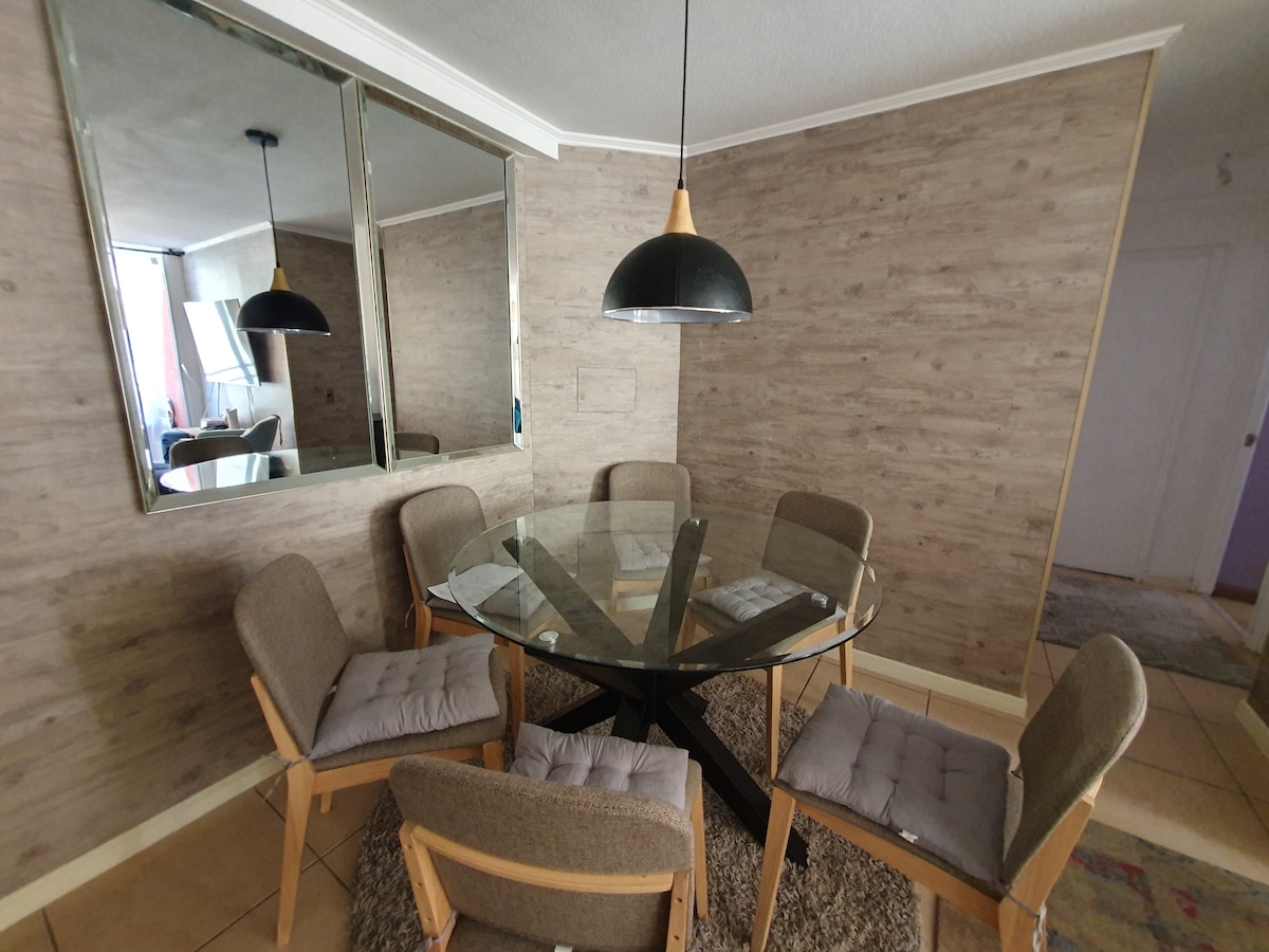 Cozy mini apartment for rent, fully furnished with transportation to the door, ideal for a person or couple looking for comfort and practicality. It has: -27 square meters of intelligently distributed space. -Wi-Fi internet -Bedroom with a double bed and closet -Water dispenser -Work space -Bathroom - Kitchen with all the amenities -Refrigerator/TV -Iron/hair dryer/bed linen Located near: - Miramar School - U. de Tarapacá - Public transportation at the door