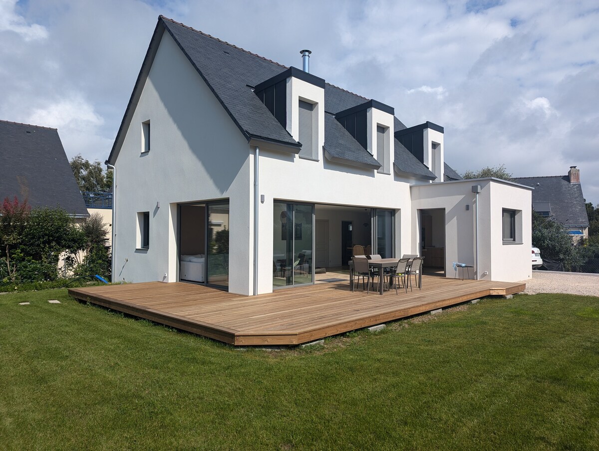 Unique ! Design beach house in Morbihan in Brittany! Direct access to the beach at the end of the garden, The house is new, fully equipped and you are the only occupants of the premises, Direct view of the beach / the sea from the living room, the kitchen, the terrace, the roof terrace and one of the bedrooms upstairs. Sheets, towels and cleaning included, washing machine and dryer. Many activities nearby: walks, cycling, sea kayaking, kite-surfing, tree climbing, cultural visits, boating...