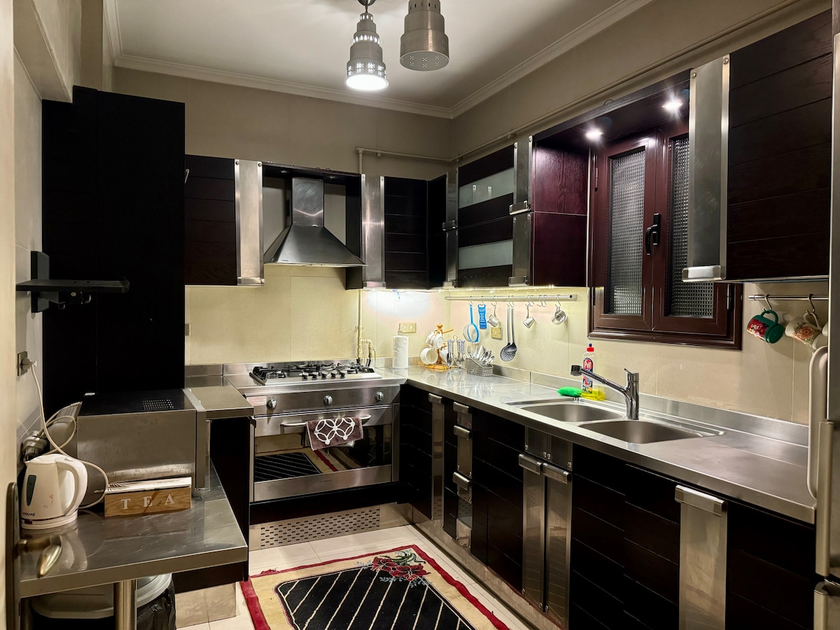 This luxurious apartment is designed in a modern and elegant style with wooden finishes in every corner, providing comfortable furniture and picturesque lighting that comforts the eye and heart. It includes 3 bedrooms, a spacious living room with a comfortable corner, a 65-inch smart TV and a hanging library with stunning decorations and wooden binding, a fully equipped kitchen, two bathrooms, and a large balcony with a charming view of the Mediterranean Sea, for an exceptional stay experience that combines comfort, luxury and beauty.