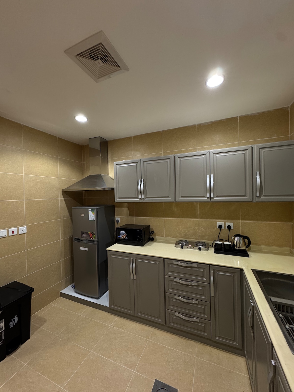 A comfortable and elegant apartment, ideal for individuals or couples, consisting of a bedroom and a complete living room. The bedroom is equipped with a comfortable bed and a spacious wardrobe, while the living room has a comfortable space for sitting and relaxing. The kitchenette is equipped with a small refrigerator, a coffee machine to prepare your favorite drinks, and a kettle for easy use. For entertainment, the lounge has a 65-inch smart TV, giving you easy access to your favorite apps and programs. In addition, free Wi-Fi is available for free to ensure you are always connected to the Internet.