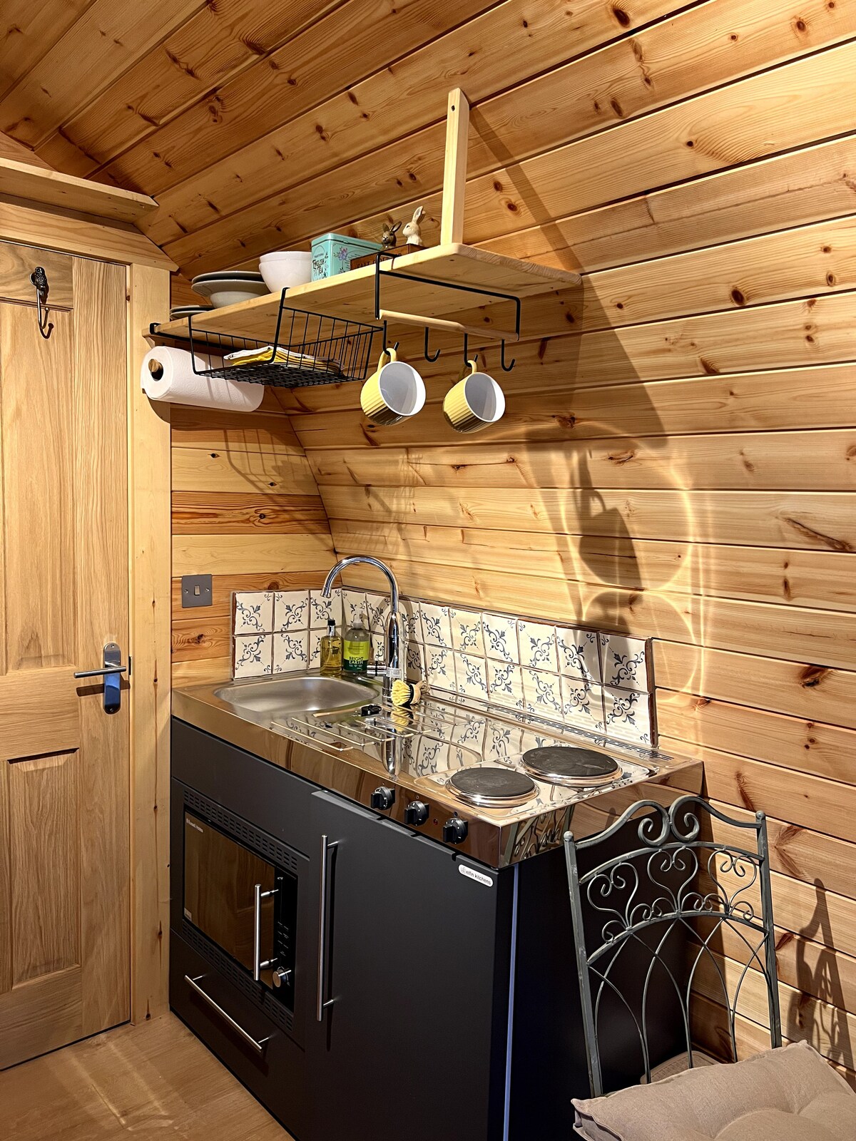 Our Cabin offers a cosy independent stay with a fully equipped kitchen, lounge, bedroom with super-king bed, luxury en-suite shower and utility with additional toilet. This eco friendly home has air sourced underfloor heating throughout and contains many upcycled items from the exterior reclaimed scaffolding boards to the many repurposed gems to be found inside. Stepping outside there is a private south facing patio and garden with its own parking space, all just a leisurely walk from town.