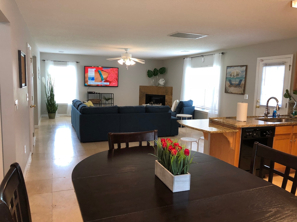 This stunning home has the feel of a destination getaway with all the perks of warm weather, beaches, and sunshine that Charleston South has to offer. Meticulously designed, for work or escape, vacation with friends, family fun or weekend getaway. You’ll have all the amenities of your own home, a wonderful open floor plan that makes for a great gathering space with a fireplace, beautiful dining space that flows out to the patio and a fully equipped kitchen! 4 bedrooms: 2 King and 2 Queen beds.