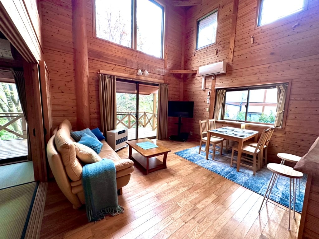 It is located in a summer resort villa area at an altitude of 900 m. Limited to one group per day, so you can relax without worrying about your children. Enjoy the view from the cottage overlooking the Kuju mountain range, the sounds of various birds, and the stars and moonlight shining in the night sky. You can easily experience villa life. This Villa does not provide meals or ingredients. There are few places nearby where you can eat out at night, so you can cook your own meals. The kitchen is fully equipped with cooking appliances, utensils, dishes, etc. There are also several hot springs 10 minutes away by car. * BBQ in the garden from late April to early October.The cold is strictly not recommended at other times.The furnace in the garden is free to use.We can provide a complete BBQ set (charcoal, grill grate, etc.) for ¥2,500.Bring your own free of charge.Please bring your own food. Not in rainy weather due to lack of roof. Yakiniku in the room is possible, but a special cleaning fee of ¥2000 will be charged separately.We will prepare the yakiniku plate as soon as you request it.