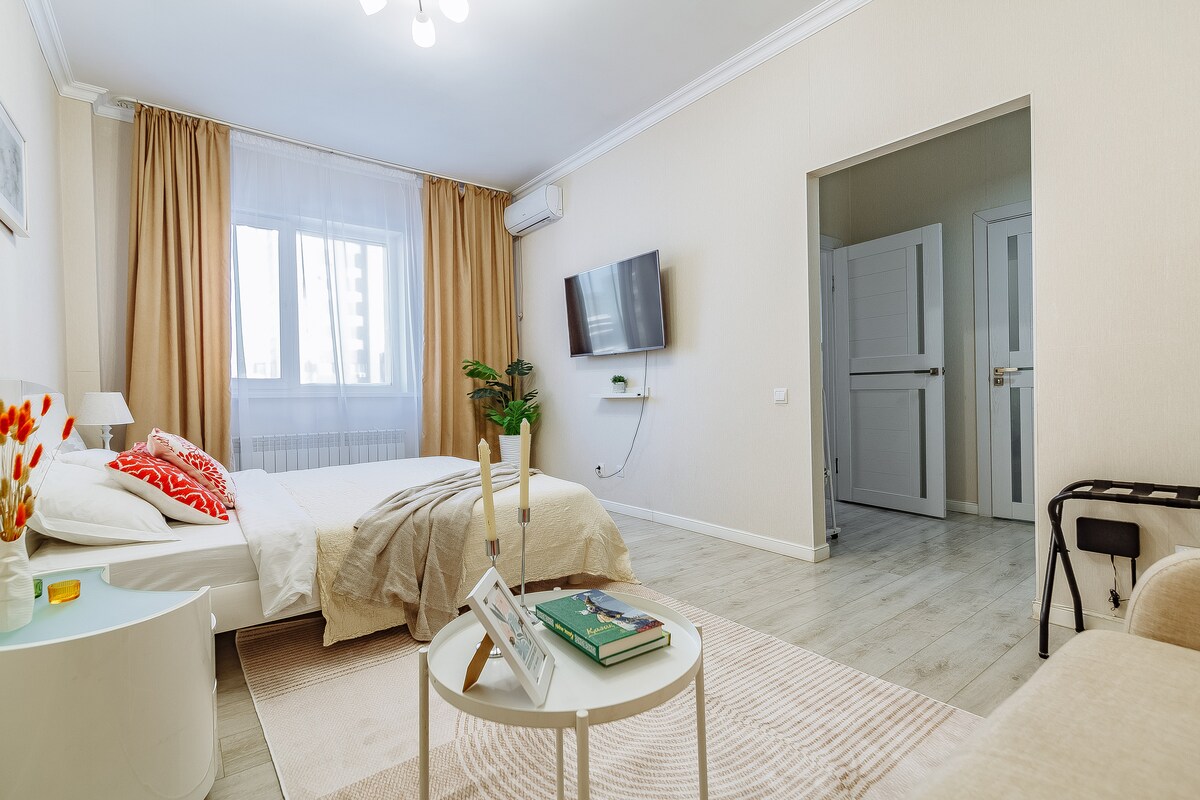 Welcome to the A-Apartments' Nexpo City! Everything is just steps away: EXPO, Mega Silk Way, Hilton, National Bank, Nazarbayev University, IT University, Invictus Fitness, AIFC, Central Mosque, and much more. Inside, you'll find: - 4 sleeping spots (a double bed and a sofa), - all the necessary appliances, dishes, towels, and bed linens, - and fast Wi-Fi. Everything for your comfort! Oh, and no smoking — let’s keep the air fresh together!
