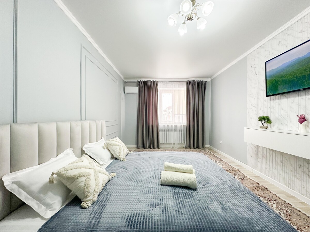 New Residential Complex 2021, Business Class "Zaman", 1 room apartment in the very center of the city at 48 Taimanov Street. 💫 3-4 beds, a double bed and a folding sofa. 💫 Unlimited WiFi 💫Smart TV, cable TV. 💫A kitchen with a full kitchen set and dishes. 💫Near Baizaar Mall, Renaissance Hotel, TCO office. 💫 With all amenities, tea, coffee, disposable toothbrushes with toothpaste, shampoo, shower gel, liquid soap. 💫We provide all the necessary documents