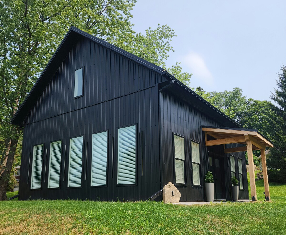 A modern single-room cabin is nestled among trees, featuring large windows that offer natural light and views of the surrounding woods. A covered porch with seating invites relaxation, while a wooden railing adds to the cabin's rustic charm.