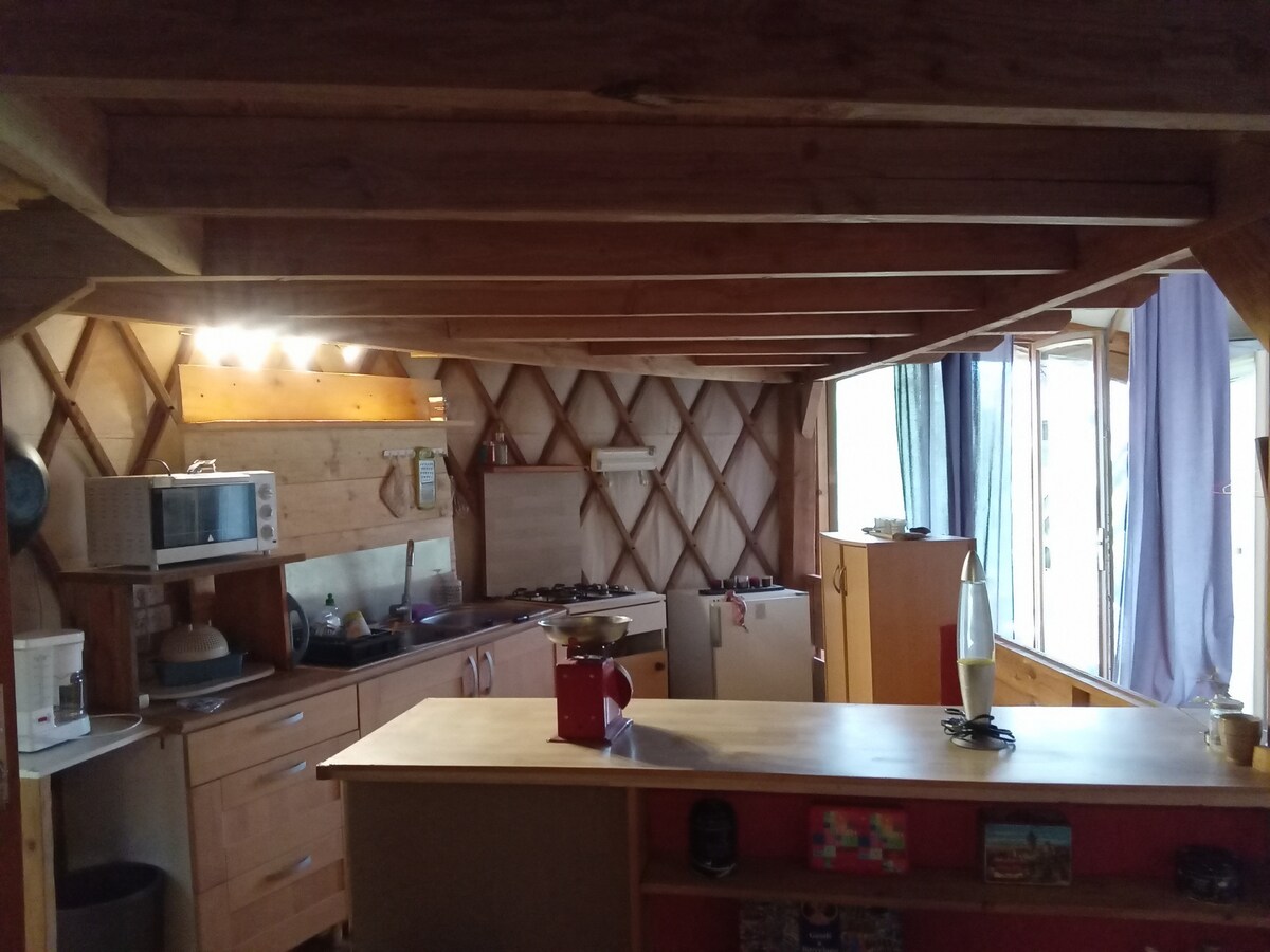 ★★★ An unusual accommodation: an atypical yurt not far from the city, in a very nice neighborhood on the edge of the forest.★★★ With terrace, private parking and access to the garden equipped with a barbecue. It has an area with two bunk beds, a seating area with a double sofa bed, an equipped kitchen and a living area. On the mezzanine, a bedroom for 2. In the chalet attached by a hallway, a bathroom with corner bathtub, dry toilet and washing machine.